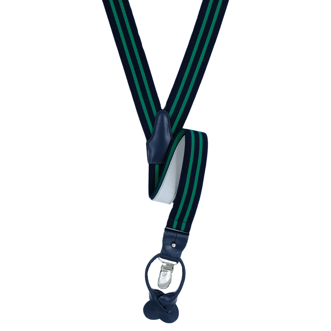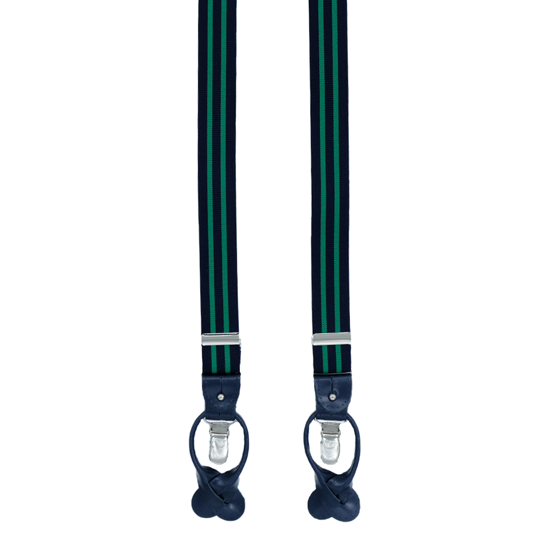 Bretelle blu righe verdi con fasce strette, inserti in vera pelle e regolabili per qualsiasi misura. Un design che ti garantirà il massimo comfort, puoi decidere di indossarle sia con clips che con bottoni.