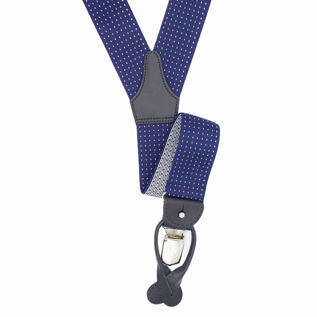 Bretelle blu chiaro pois bianchi con fasce larghe, presenta una micro fantasia a pois con inserti in vera pelle di colore blu scuro. Perfette per avere uno stile sempre unico ed elegante. Puoi decidere di indossarla sia con clips che con bottoni. Queste bretelle sono prodotte interamente in Italia.