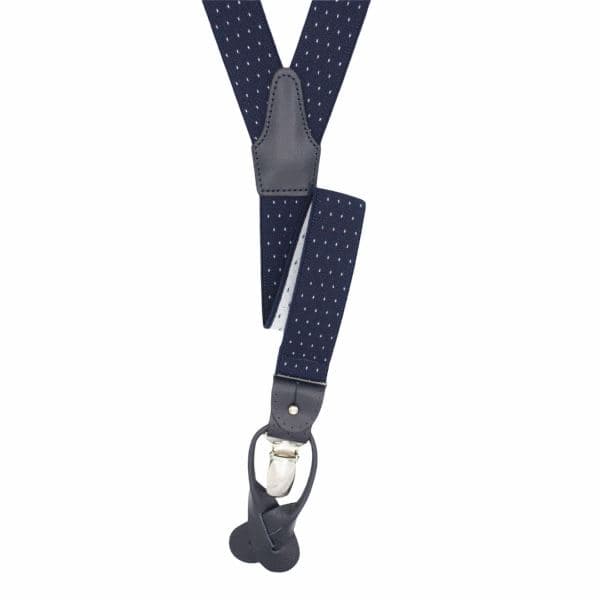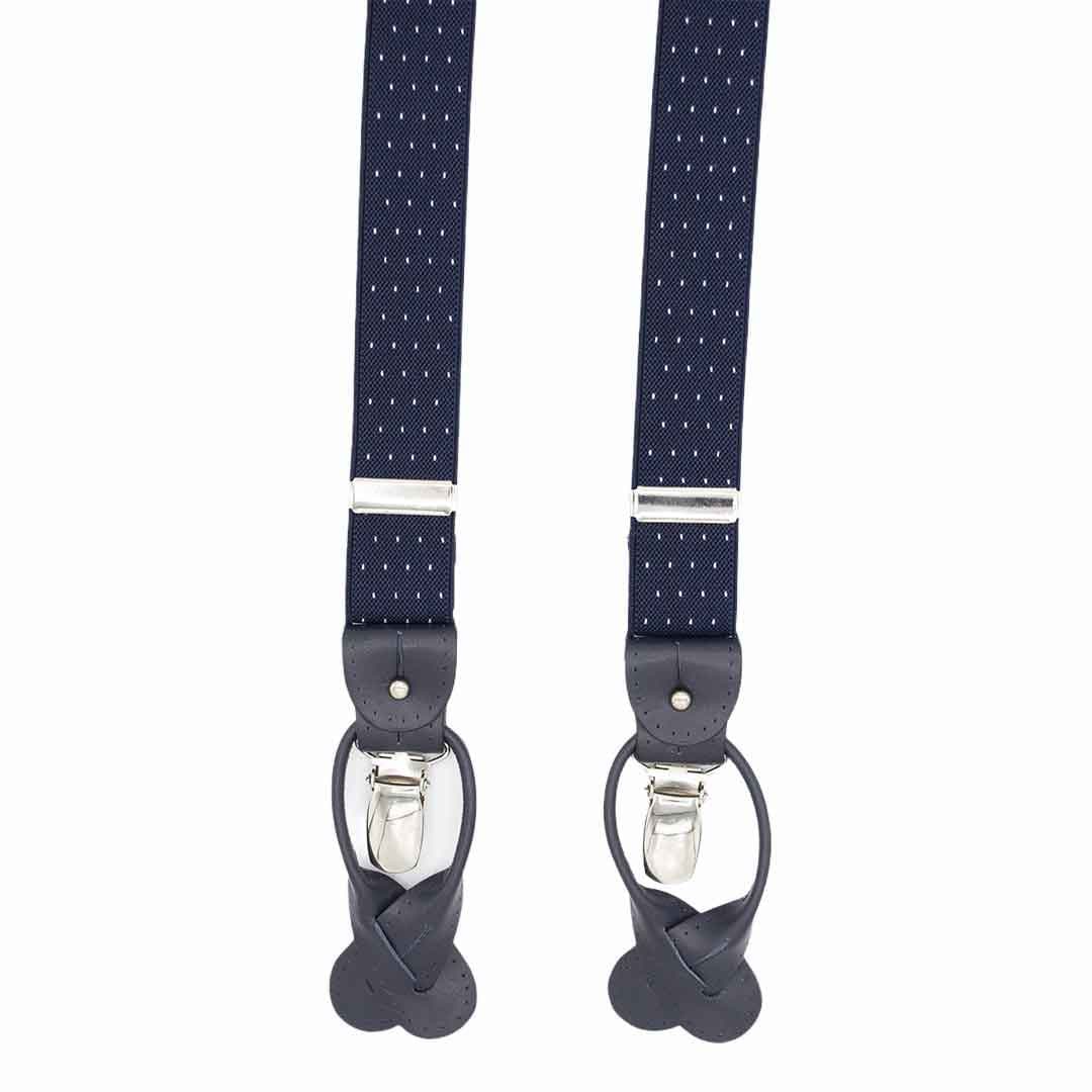 Bretelle blu pois bianchi con fasce strette, inserti in pelle e regolabili per qualsiasi misura. Caratterizzate da una micro fantasia a pois bianchi su un fondo blu. Ideali per look eleganti e casual. Rifinite con dettagli in vera pelle dello stesso colore.