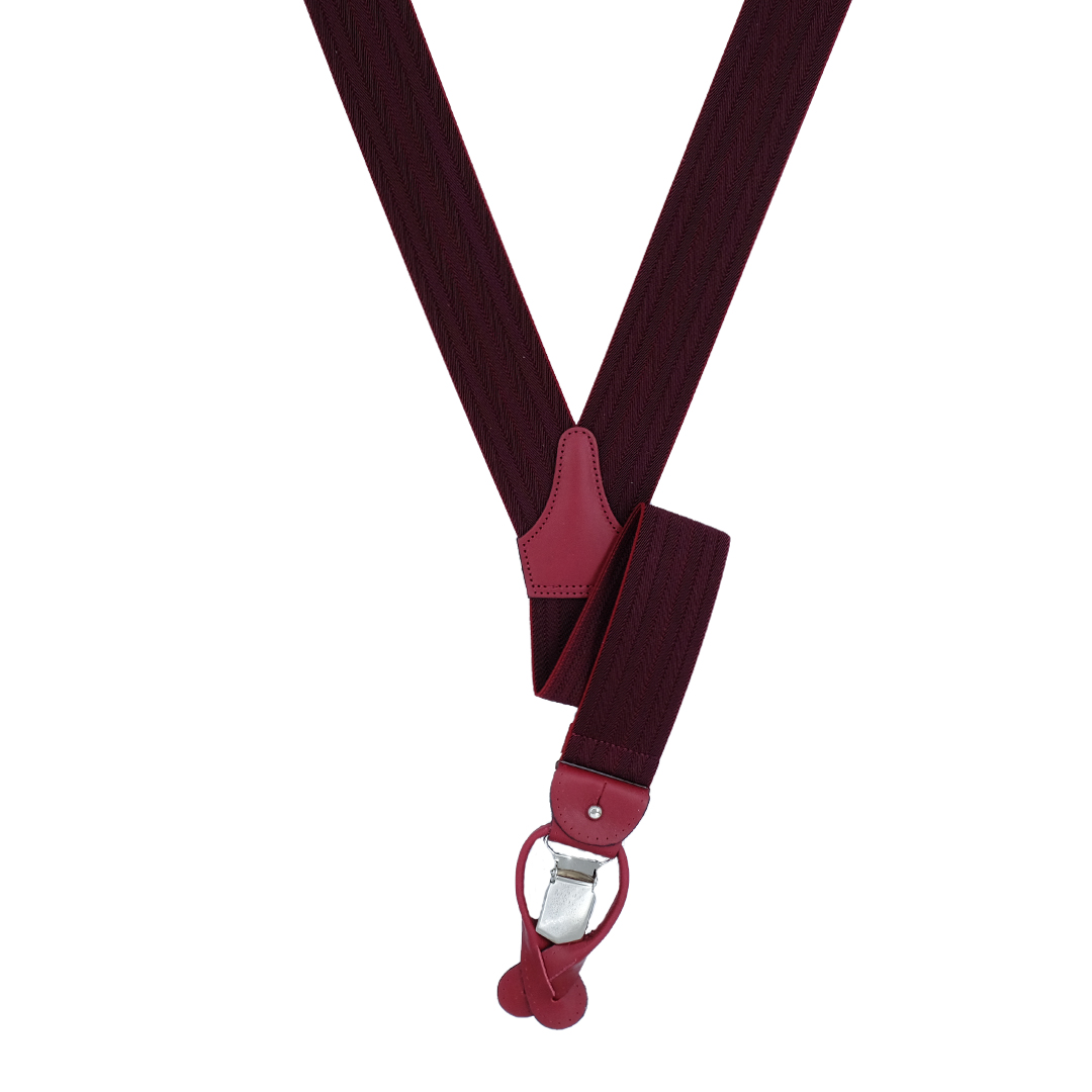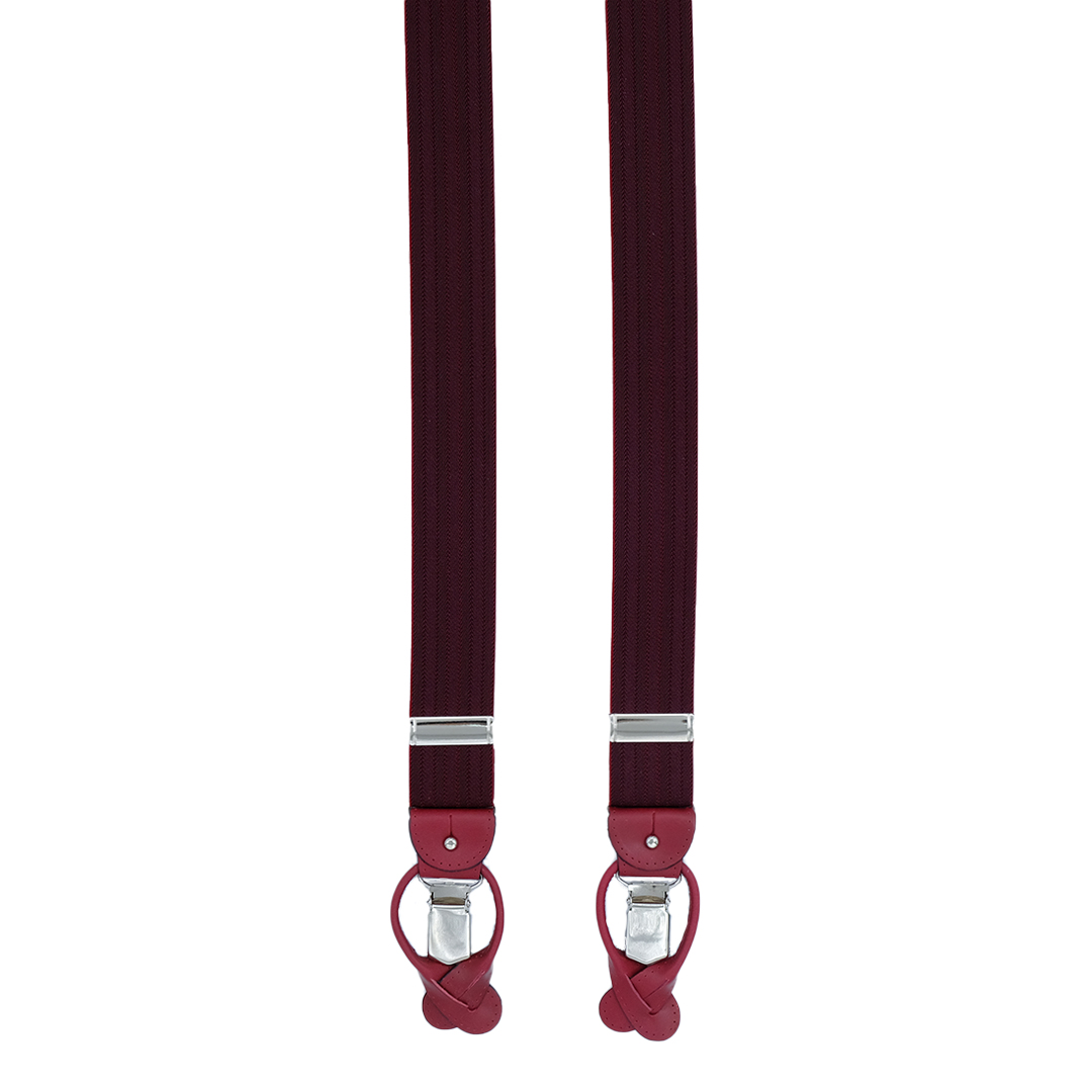 Bretelle bordeaux spigatino con fasce larghe. Sono perfette da aggiungere alla tua collezione di bretelle, rifinite con eleganti inserti in pelle. Queste bretelle sono perfette per adattarsi a qualsiasi misura e occasione.