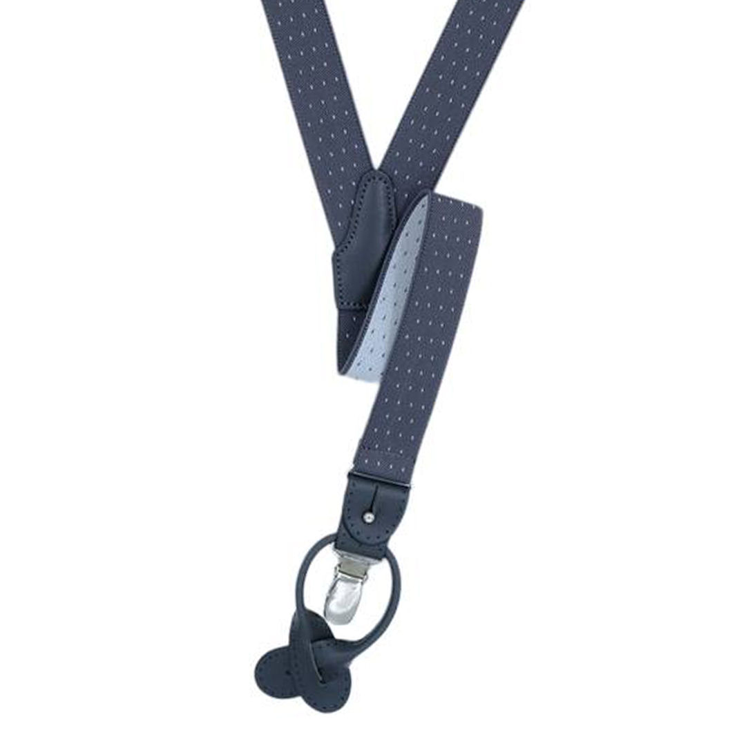 Bretelle grigio pois bianchi con fasce strette, presenta una fantasia con pois bianchi su un fondo grigio. Sono perfette da aggiungere alla tua collezione di bretelle, sono rifinite con eleganti inserti in pelle. Regolabili e adatte per qualsiasi misura doneranno stile ai tuoi outfit d’ufficio.