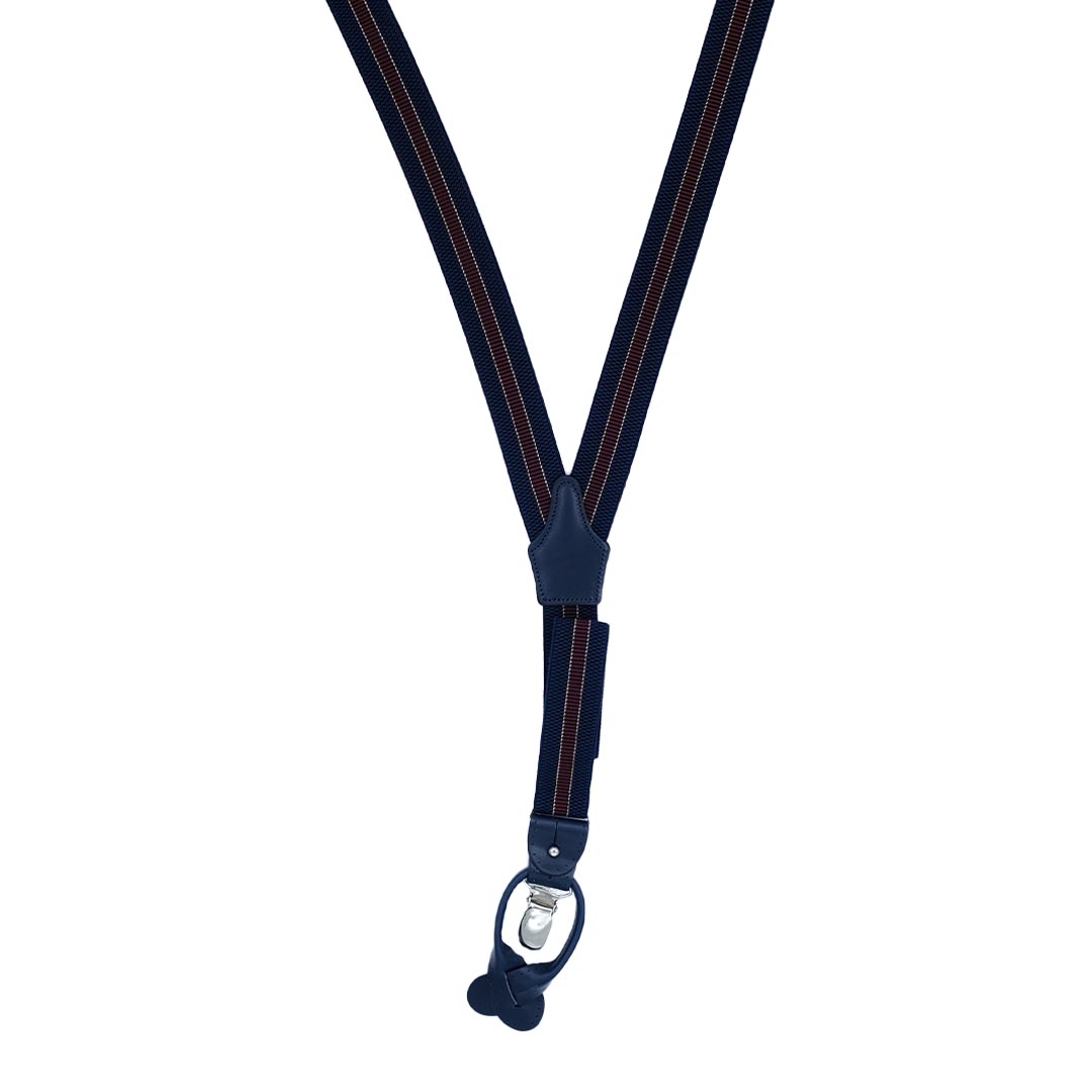 Bretelle regimental blu/bordeaux, dotate di fasce elastiche che si indossano facilmente e si adattano a qualsiasi misura. Gli inserti completamente in vera pelle garantiscono una migliore sostenibilità e comodità. Puoi scegliere di indossarle sia con clips che con bottoni.