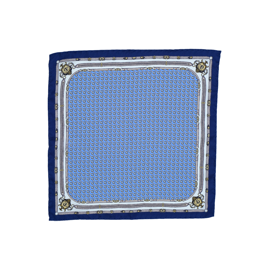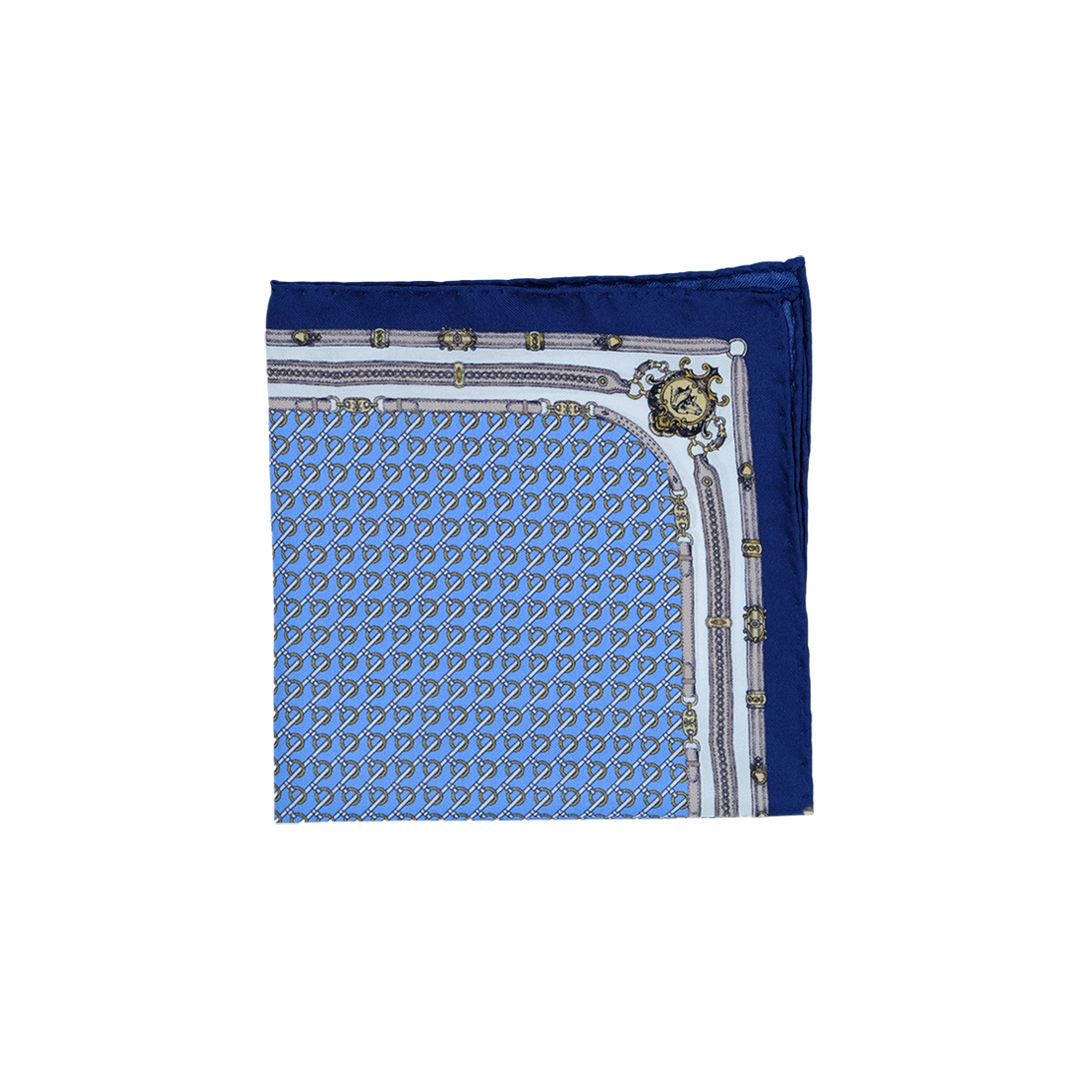 Fazzoletto in 100% seta è completamente fatto a mano con metodi di lavorazione artigianale. I tessuti provengono dalle migliori seterie di Como. Il fazzoletto presenta una micro fantasia geometrica gialla e blu su un fondo azzurro ed un bordo blu. Il tessuto realizzato in morbida seta permetterà di non creare rigonfiamenti nella tasca della giacca.