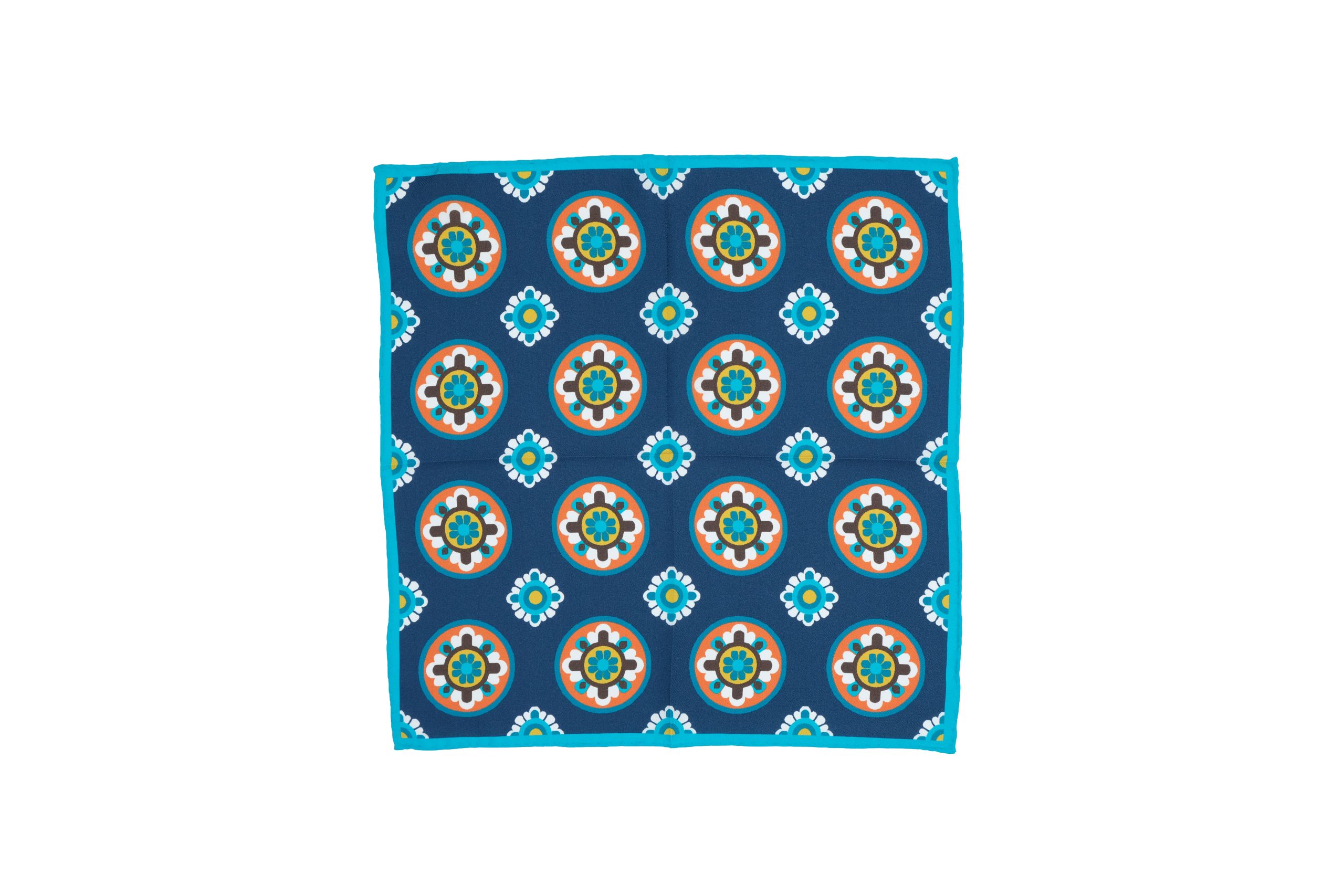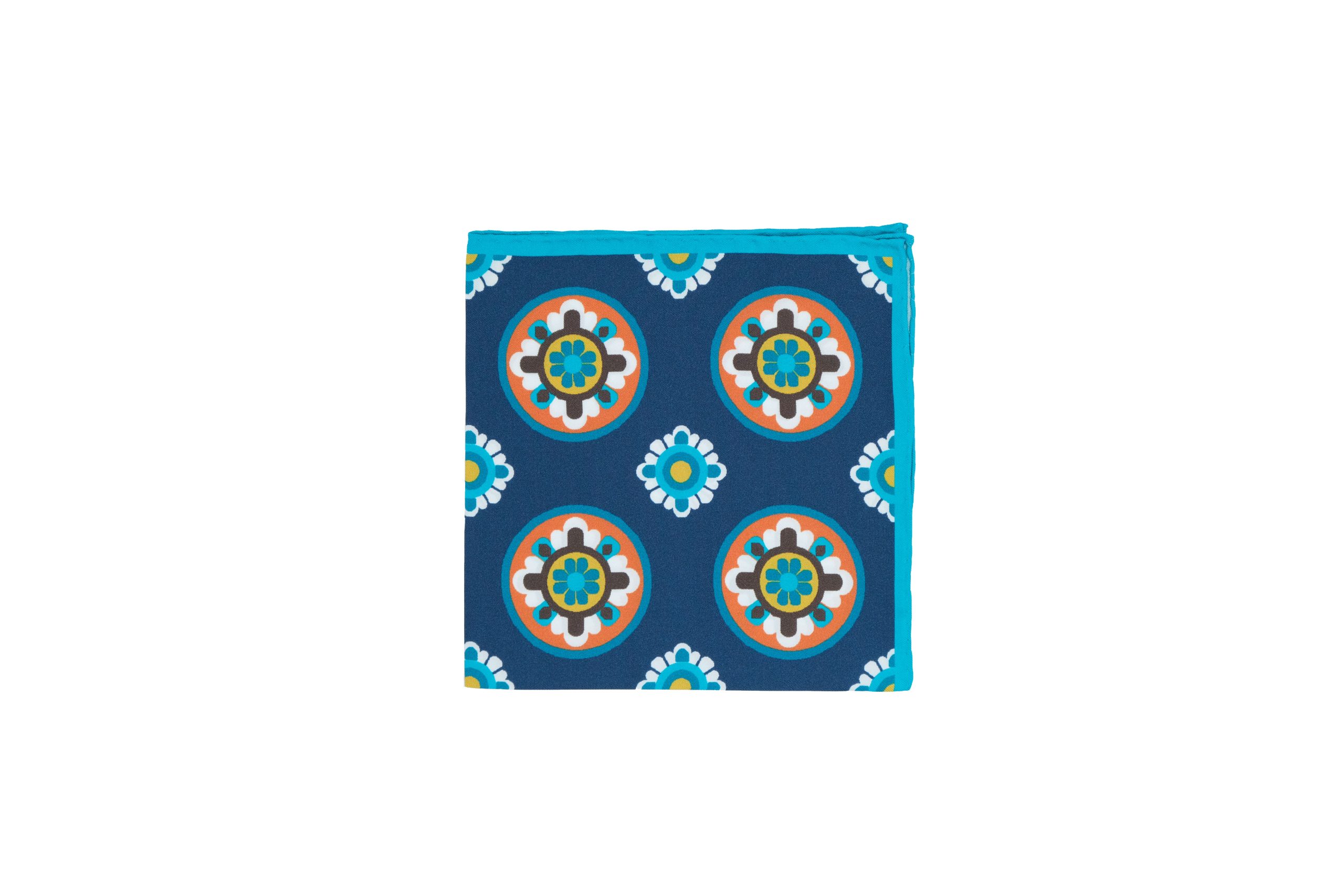 Fazzoletto in 100% seta è completamente fatto a mano con metodi di lavorazione artigianale. I tessuti provengono dalle migliori seterie di Como. Il fazzoletto da taschino presenta una fantasia floreale su fondo blu e bordo azzurro. Il modo perfetto per completare un abbigliamento su misura è abbinare questo fazzoletto da taschino floreale.